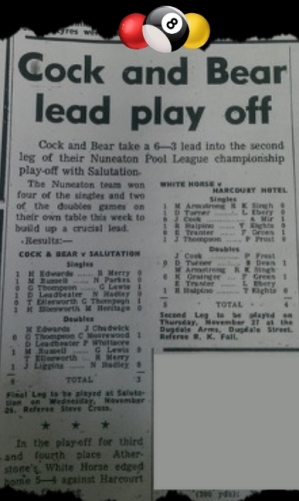 The inaugural season saw the teams play 9 frames (6 singles and 3 doubles) a match, Attleborough Sports became the 1st team to drop out during the season which ended with both groups remarkable being won on frame difference. Cock & Bear winning Group A and the Salutation taking Group B with the Harcourt and White Horse finishing 2nd in their respective groups. In the final the Cock & Bear took a 6 - 3 lead into the 2nd leg while the White Horse took a narrow 5 - 4 1st leg lead. In the return legs both matches were close again with the Cock & Bear winning 5 - 4 for an 11 - 7 aggregate win and became the 1st ever Nuneaton Pool league champions. Atherstone's White Lion beat the Harcourt 5 - 4 for an overall 10 - 8 aggregate victory to take 3rd place.